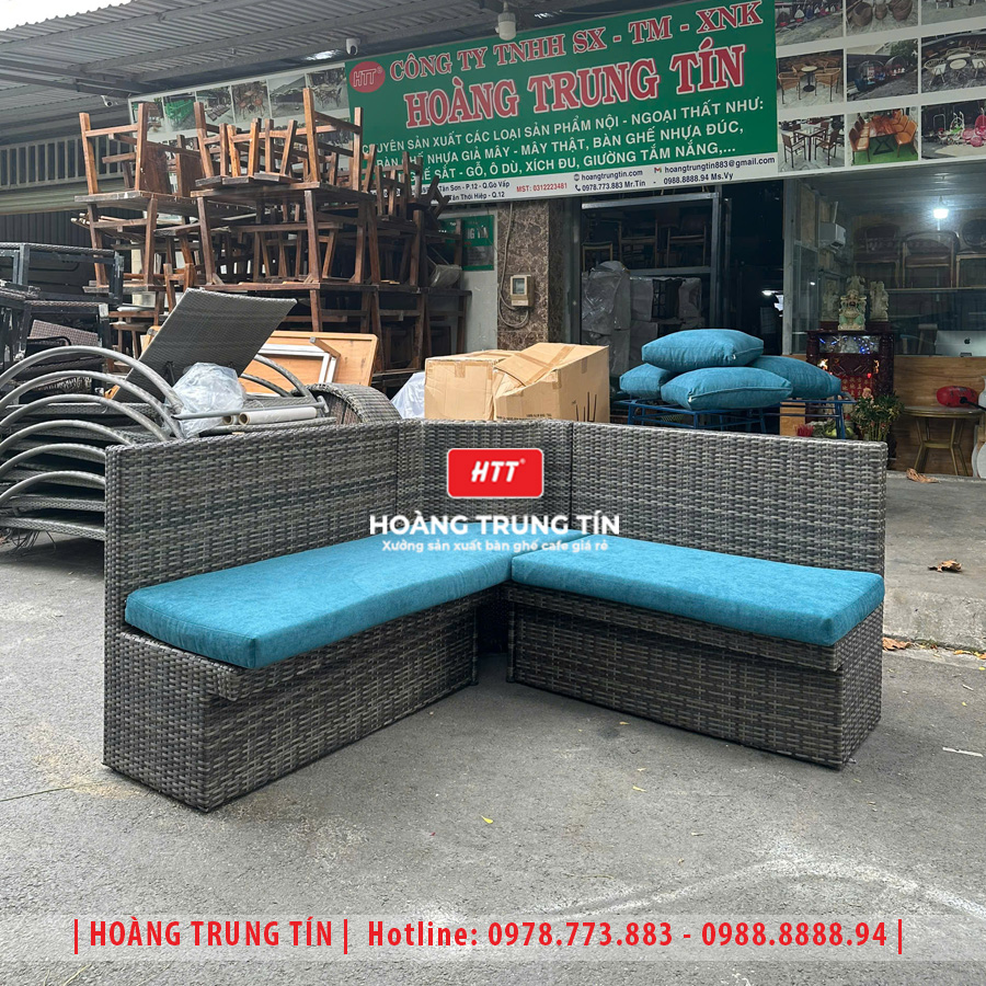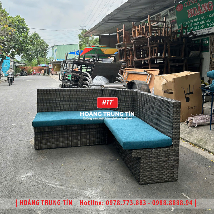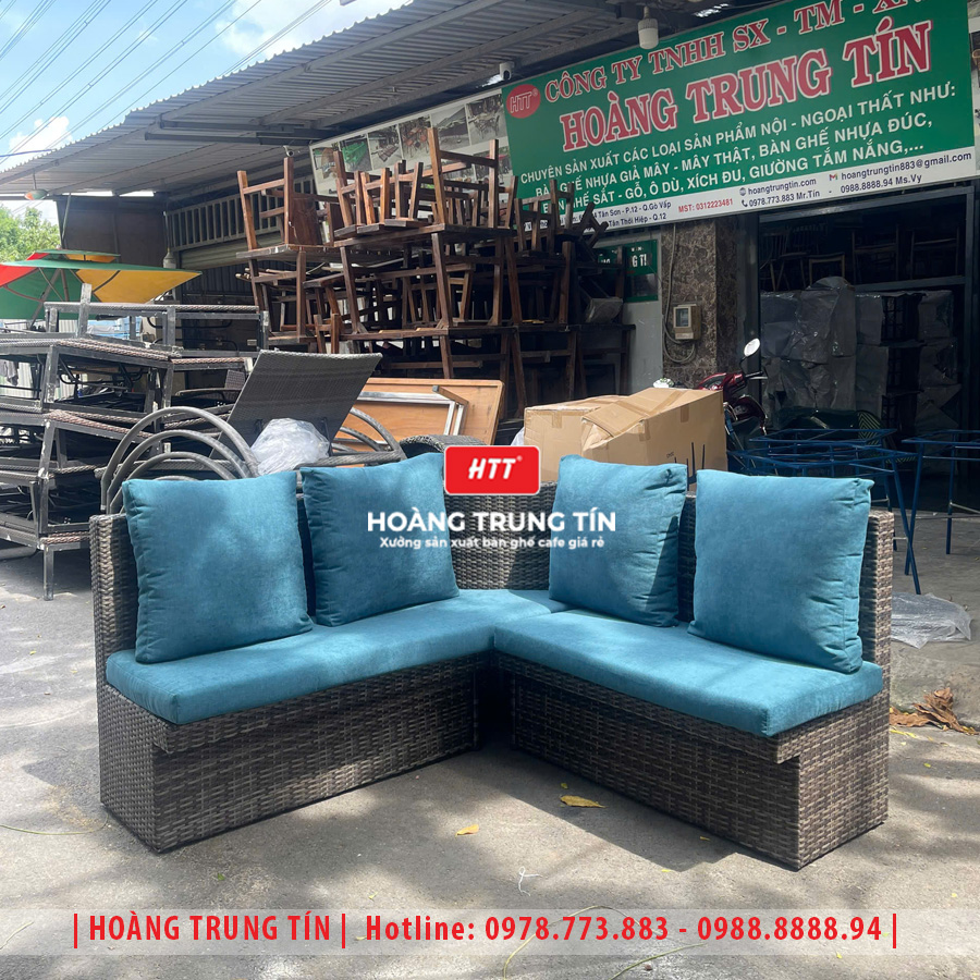 Ở mẫu ghế trong hình bạn cung cấp — sofa góc L nhựa giả mây với nệm xanh ngọc — là thiết kế được nhiều quán cà phê sân vườn lựa chọn bởi vừa tiết kiệm diện tích, vừa tạo cảm giác thư giãn.